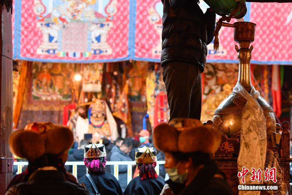 圖為工作人員將青稞酒倒入女神白拉姆像前的酒壇。