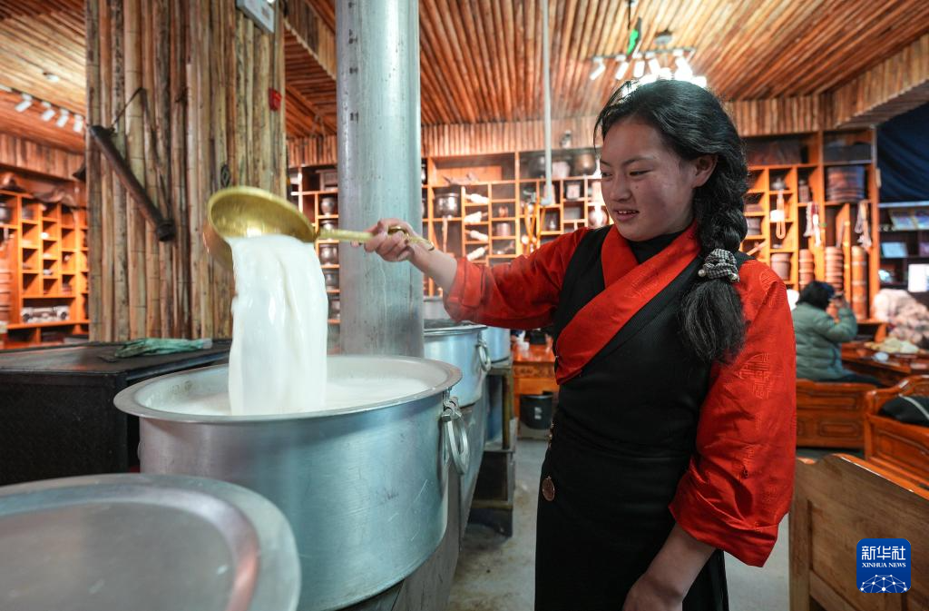 “牧人寶庫”藏式茶館服務員在熬制奶茶(2月13日攝)。新華社記者 晉美多吉 攝