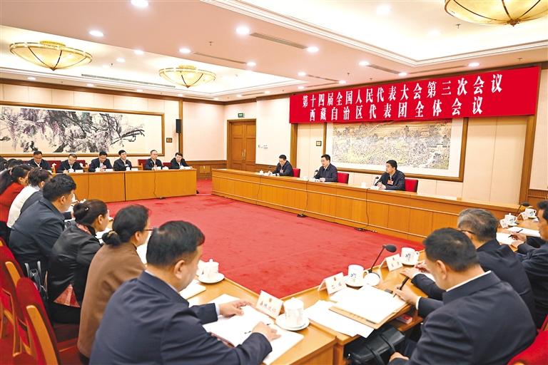 西藏代表團團長、自治區(qū)黨委書記王君正主持并講話。西藏代表團副團長、自治區(qū)黨委副書記、自治區(qū)人大常委會主任嚴金海,西藏代表團副團長、自治區(qū)黨委副書記、自治區(qū)主席嘎瑪澤登參加審議。