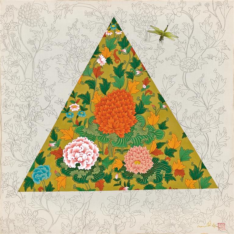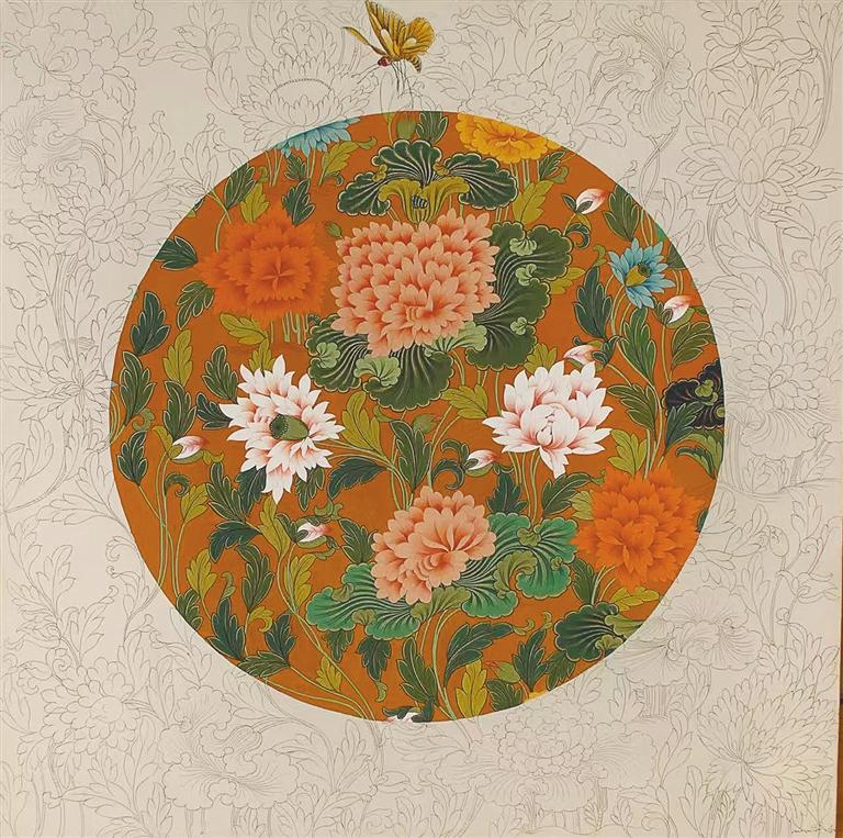 “我喜歡把傳統(tǒng)的壁畫、唐卡里的花卉等元素表現(xiàn)在作品中,其次將這些元素進行當(dāng)代轉(zhuǎn)譯,通過布面重彩的形式重構(gòu)敘事,最后注入對西藏現(xiàn)代化進程的深度觀照?!崩痛稳收f,“這種創(chuàng)新不是簡單的符號拼貼,而是要在吃透傳統(tǒng)技藝精髓的基礎(chǔ)上,像青稞扎根土壤般從西藏本土文化中生長出當(dāng)代藝術(shù)語言?!?/p>