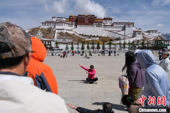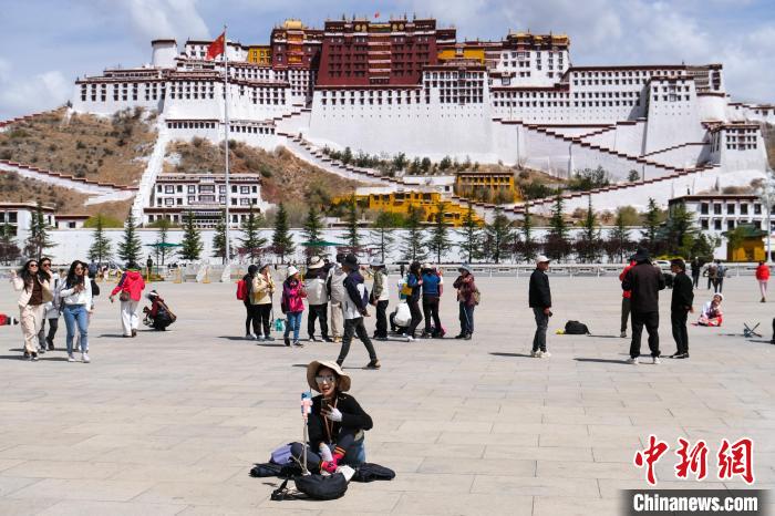 4月18日,游客在拉薩布達(dá)拉宮廣場(chǎng)拍照留念。中新社記者 江飛波 攝