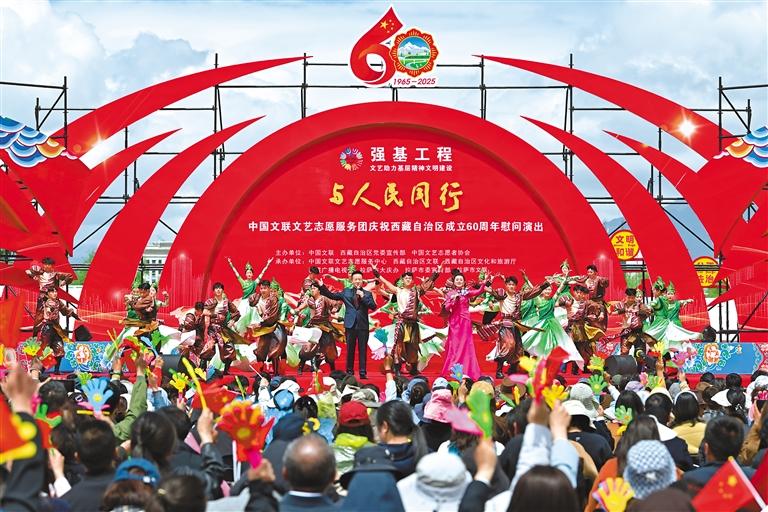 上午10時整,“與人民同行”中國文聯(lián)文藝志愿服務(wù)團慶祝西藏自治區(qū)成立60周年慰問演出,在歌舞《鼓舞西藏》的熱烈氛圍中正式開場。