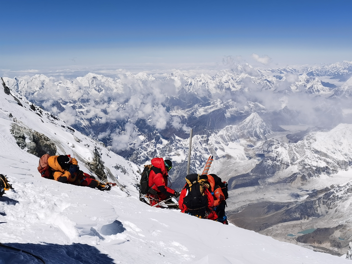 2020年5月27日,2020珠峰高程測量登山隊(duì)成功登頂世界第一高峰珠穆朗瑪峰。他們在峰頂豎立覘標(biāo),安裝GNSS天線,開展各項(xiàng)峰頂測量工作。新華社特約記者 扎西次仁 攝
