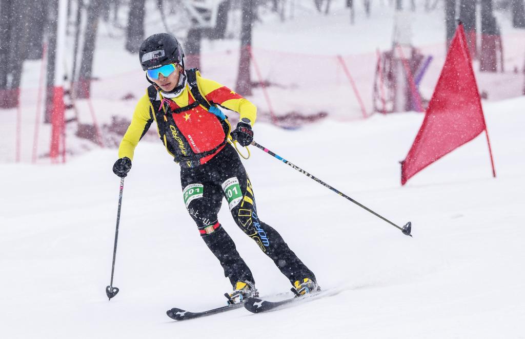中國滑雪登山運(yùn)動員玉珍拉姆在新疆富蘊(yùn)縣可可托海國際滑雪度假區(qū)進(jìn)行的全國首屆滑雪登山冠軍賽短距離(女子組)比賽中。(2023年4月8日攝)。新華社記者 胡虎虎 攝