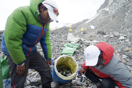 圖為西藏拉薩喜馬拉雅登山向?qū)W(xué)校的向?qū)冊谥榉暹M(jìn)行垃圾清理(2016年5月21日攝)。 新華社發(fā)(扎西次仁攝)