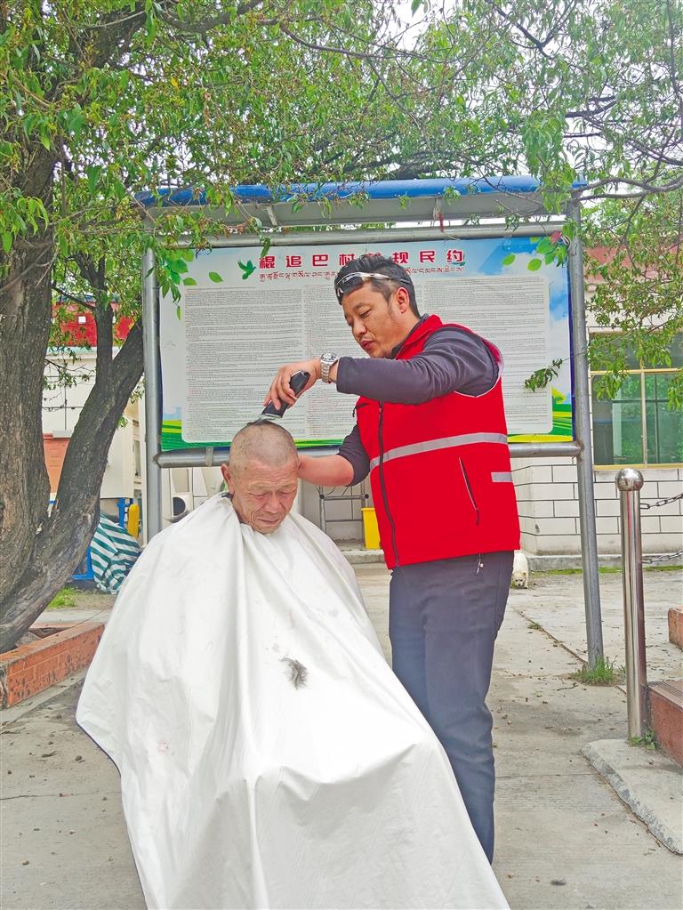 “次仁啦,夏天來了,天氣開始熱了,我把你的頭發(fā)修短點好不好?”在電推子的嗡嗡聲停止后,75歲的次仁邊照著鏡子邊摸著自己的頭說:“十分感謝,感覺我年輕了二十歲喲!”理完發(fā)的小朋友巴桑,蹦跳著跑到小伙伴跟前:“快看我的新發(fā)型,像不像解放軍叔叔?”