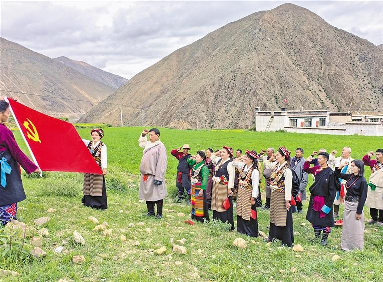 為熱烈慶祝中國(guó)共產(chǎn)黨成立104周年,7月1日,自治區(qū)稅務(wù)局駐謝通門縣仁欽則鄉(xiāng)倫珠孜村工作隊(duì)組織全體黨員在田間地頭開(kāi)展重溫入黨誓詞活動(dòng)。