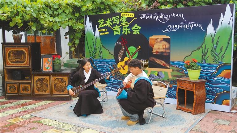 在音樂鑒賞環(huán)節(jié),拓崗扎念樂隊將傳統(tǒng)扎念琴演奏與現(xiàn)代音樂結(jié)合,表演了《卓木仁青崗》等曲目;青年歌手次仁羅布演唱藏族民歌,展現(xiàn)非遺特色。在藝術對談中,青年畫家雍忠卓瑪分享了自己克服身體障礙堅持創(chuàng)作的經(jīng)歷,圍繞“自然與藝術的關系”展開討論,結(jié)合作品從藏族文化和鄉(xiāng)土景觀中獲取創(chuàng)作靈感的過程。在寫生體驗環(huán)節(jié),活動參與者以德慶鎮(zhèn)民居和周邊自然景色為素材進行創(chuàng)作,雍忠卓瑪從構(gòu)圖、色彩運用等方面給予指導,幫助活動參與者完成10余幅繪畫作品。