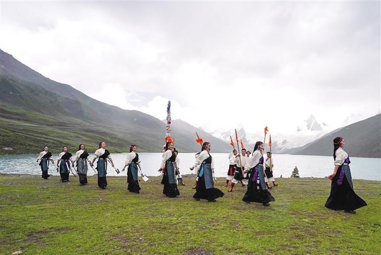西藏那曲市比如縣藝術(shù)團的演員在薩普雪山景區(qū)為游客表演(7月19日攝)。新華社記者 晉美多吉 攝