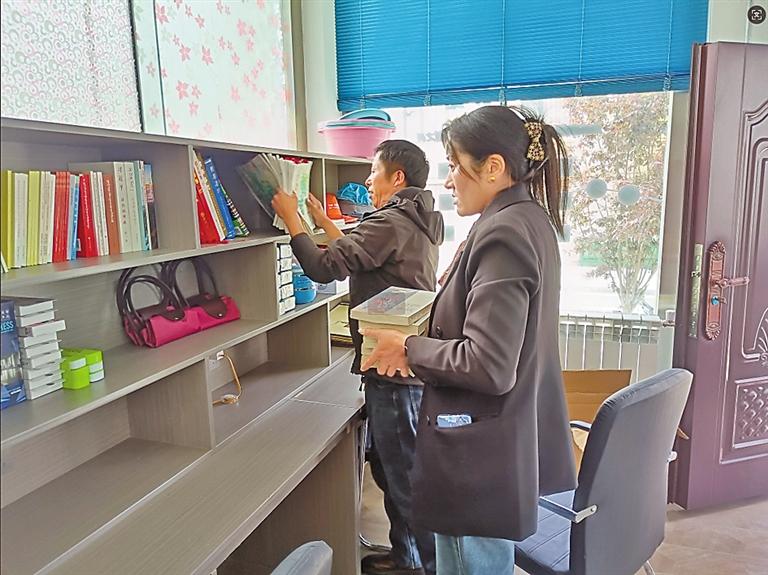 圖為措美鎮(zhèn)當(dāng)許社區(qū)黨員志愿者在驛站內(nèi)擺放圖書和充電器等供群眾免費(fèi)使用。記者 丹增平措 攝
