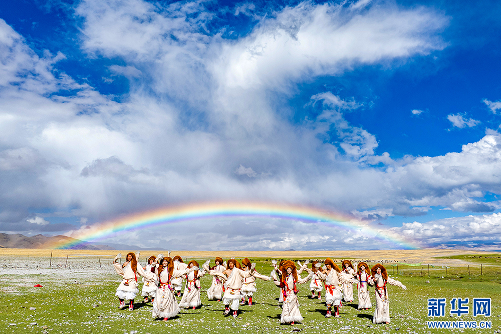 身穿自治區(qū)級(jí)非物質(zhì)文化遺產(chǎn)“森郭服飾”的改則縣群眾在湖畔跳鍋莊(6月21日攝)?!吧棥北蛔u(yù)為“五彩彩虹服”,主要由紅、綠、黑、黃、藍(lán)五種顏色的氆氌制成。新華網(wǎng) 旦增努布 攝