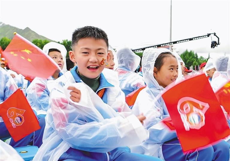 圖為西藏自治區(qū)成立60周年慶祝大會(huì)現(xiàn)場,臺(tái)下小朋友揮舞著國旗。記者 丹增群培 攝