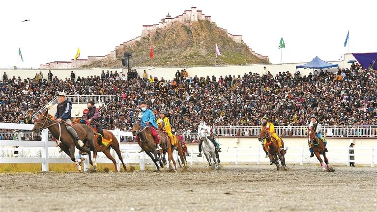 “達(dá)瑪”藏語(yǔ)意為“跑馬射箭”。每年的達(dá)瑪節(jié),賽馬都會(huì)吸引十里八鄉(xiāng)的人們前來觀賽。賽馬場(chǎng)上人頭攢動(dòng),隨著發(fā)令聲響,一匹匹駿馬如離弦之箭沖出起跑線,騎手俯身貼在馬背上,揚(yáng)鞭馳騁,你追我趕,奮勇爭(zhēng)先。觀眾席上,人們隨著比賽節(jié)奏,時(shí)而激動(dòng),時(shí)而安靜,時(shí)而歡呼,時(shí)而嘆息。藏族阿媽次仁卓嘎難掩激動(dòng),她告訴記者,幾乎每年都會(huì)和家人來看賽馬。賽場(chǎng)上,選手們堅(jiān)韌不拔、昂揚(yáng)向上的精神風(fēng)貌讓人動(dòng)容,也激勵(lì)著一代又一代英雄城兒女為祖國(guó)發(fā)展繁榮而不懈奮斗。