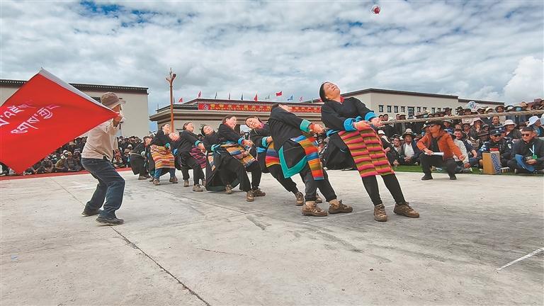 圖為拔河比賽競(jìng)爭(zhēng)激烈,各支代表隊(duì)拼盡全力。