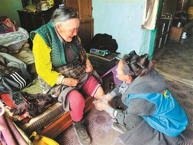 清晨的陽(yáng)光灑在林周縣春堆鄉(xiāng)卡東村的土路上,林周縣民政服務(wù)站工作人員旦增旺姆背著裝滿(mǎn)蔬菜和藥品的布袋,熟門(mén)熟路地走進(jìn)仁增拉卓老人的院子。“阿媽啦,今天給您帶了新鮮的蘿卜,再把降壓藥給您續(xù)上?!?3歲的仁增拉卓顫巍巍迎上來(lái),拉著旦增旺姆的手笑得眼角堆起皺紋——這樣的清晨探望,早已成為老人日常生活里的“定心丸”。