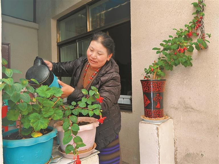 圖為那曲市林廓社區(qū)居民斯曲在自家陽光房里整理花卉。記者 萬靖 攝