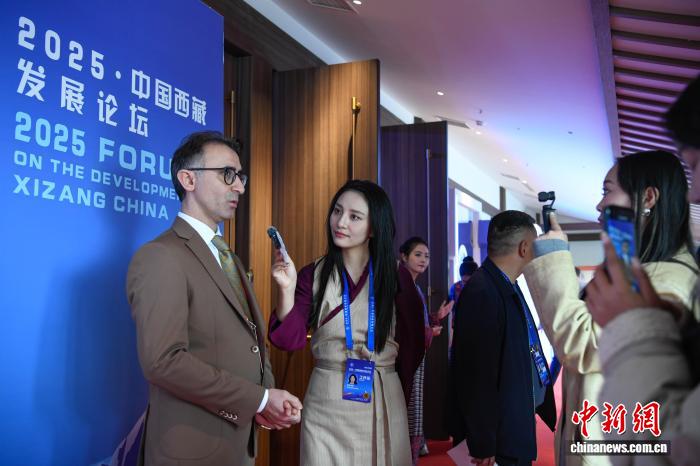 10月29日,“遇見(jiàn)美麗西藏 書(shū)寫(xiě)雪域新篇”為主題的2025·中國(guó)西藏發(fā)展論壇在林芝開(kāi)幕。來(lái)自40多個(gè)國(guó)家和地區(qū)的400多名中外嘉賓參會(huì)。圖為藏族記者采訪外國(guó)嘉賓。中新社記者 貢嘎來(lái)松 攝