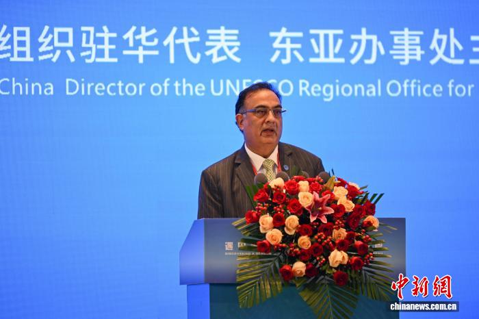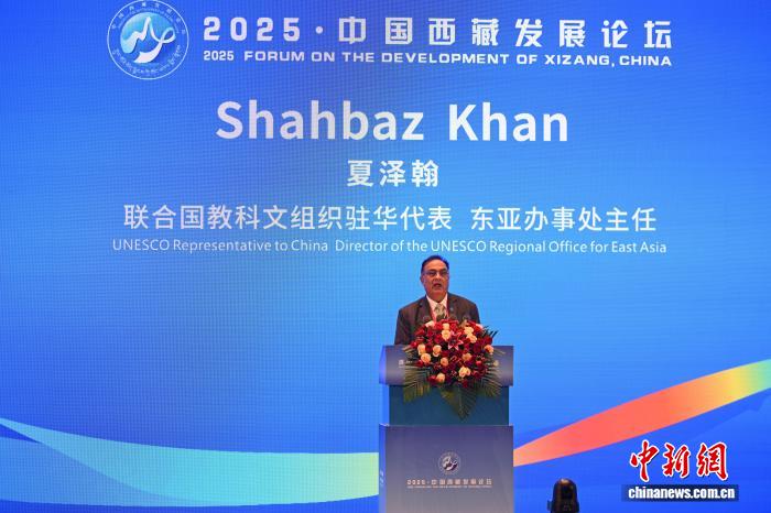 10月29日,“遇見(jiàn)美麗西藏 書(shū)寫(xiě)雪域新篇”為主題的2025·中國(guó)西藏發(fā)展論壇在林芝開(kāi)幕。來(lái)自40多個(gè)國(guó)家和地區(qū)的400多名中外嘉賓參會(huì)。圖為聯(lián)合國(guó)教科文組織駐華代表 東亞辦事處主任夏澤翰在開(kāi)幕式上發(fā)言。中新社記者 貢嘎來(lái)松 攝