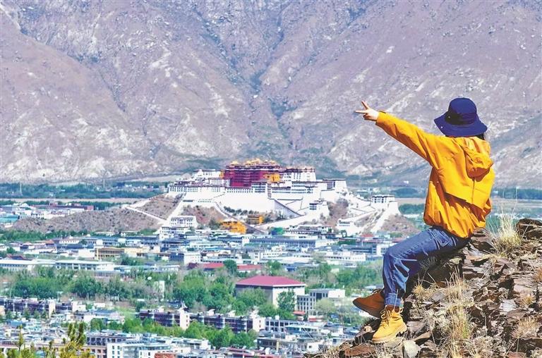 游客以布達(dá)拉宮為背景參與創(chuàng)意旅拍。記者 鄭常容 攝
