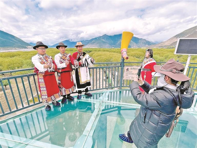 林芝尼洋河國(guó)家濕地公園旁,游客駐足合影,定格江河美景。記者 次仁平措 攝