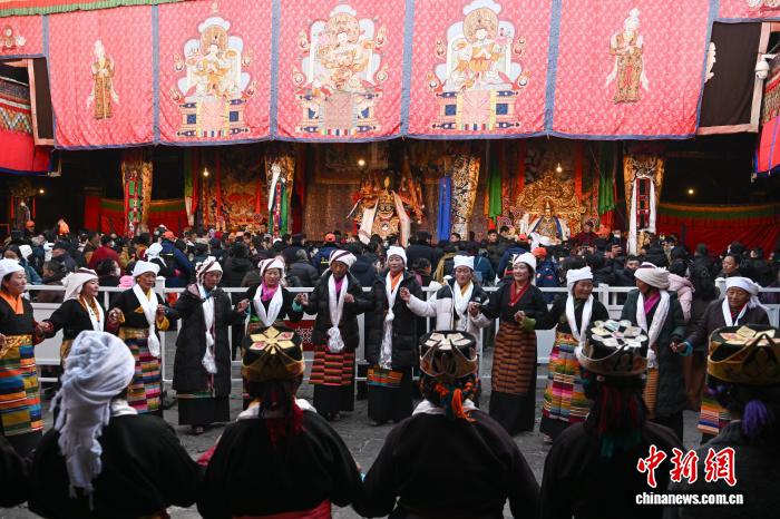 圖為身著民族服裝的信眾在大昭寺內(nèi)載歌載舞。中新社記者 貢嘎來(lái)松 攝