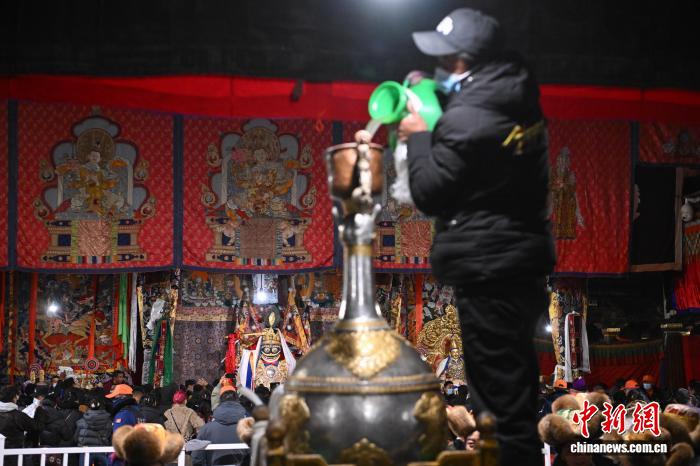 圖為工作人員將青稞酒倒入女神白拉姆像前的酒壇。中新社記者 貢嘎來(lái)松 攝