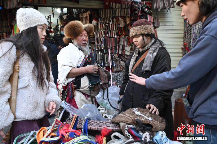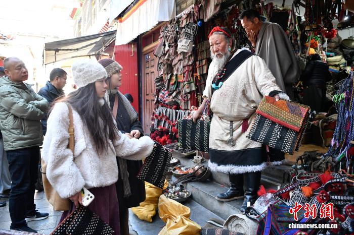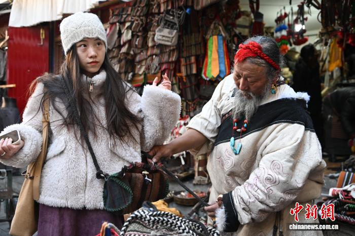 12月9日,西藏拉薩市八廓街沖賽康旁的背陰巷口,55歲店主次仁羅布的藏式老物件小店熱鬧非凡。不足30平方米的空間里,烏朵、馬包、藏式氆氌側(cè)掛包等好物琳瑯滿目,既有時(shí)光沉淀的老物件,也有手藝人新制精品。小店吸引本地民眾、年輕人及游客紛紛選購(gòu),生意紅火。圖為游客選購(gòu)藏式氆氌側(cè)掛包。中新社記者 貢嘎來(lái)松 攝