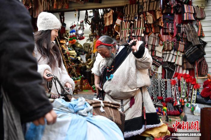 圖為藏式老物件店主次仁羅布給游客推薦藏式氆氌側(cè)掛包。中新社記者 貢嘎來(lái)松 攝