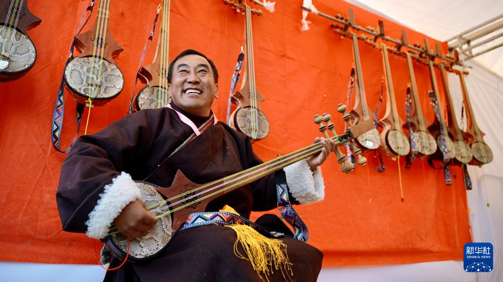 來自曲松縣朱麥沙村的洛桑曲扎,在攤位前彈起自己手工制作的扎念琴,悅耳的琴聲吸引人們紛紛停下腳步。
