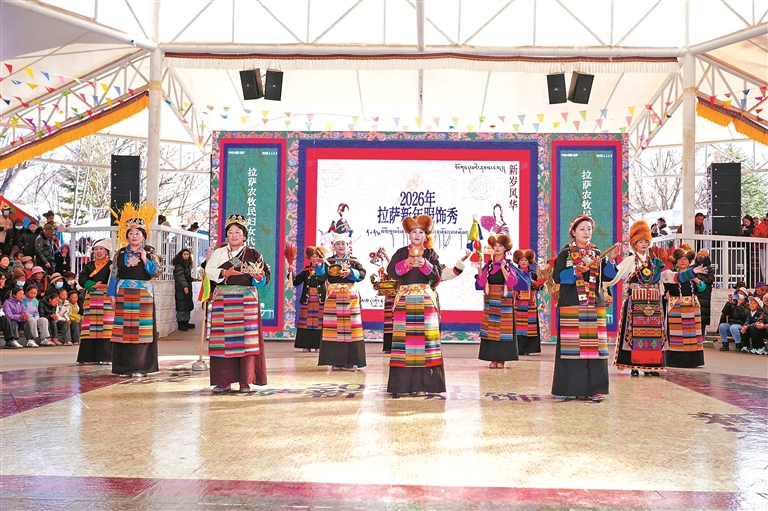 圖為2026拉薩新年服飾秀拉薩農牧民婦女代表“村T秀”宗角祿康公園活動現(xiàn)場。圖/文 記者 格桑倫珠