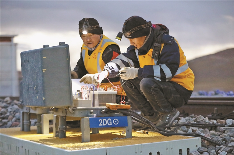圖為近日,中國(guó)鐵路青藏集團(tuán)有限公司拉薩基礎(chǔ)設(shè)施段那曲信號(hào)車間扎加藏布信號(hào)工區(qū)職工在對(duì)信號(hào)機(jī)進(jìn)行電氣特性測(cè)試及數(shù)據(jù)記錄。記者 旦增蘭澤 通訊員 拉巴次仁 攝