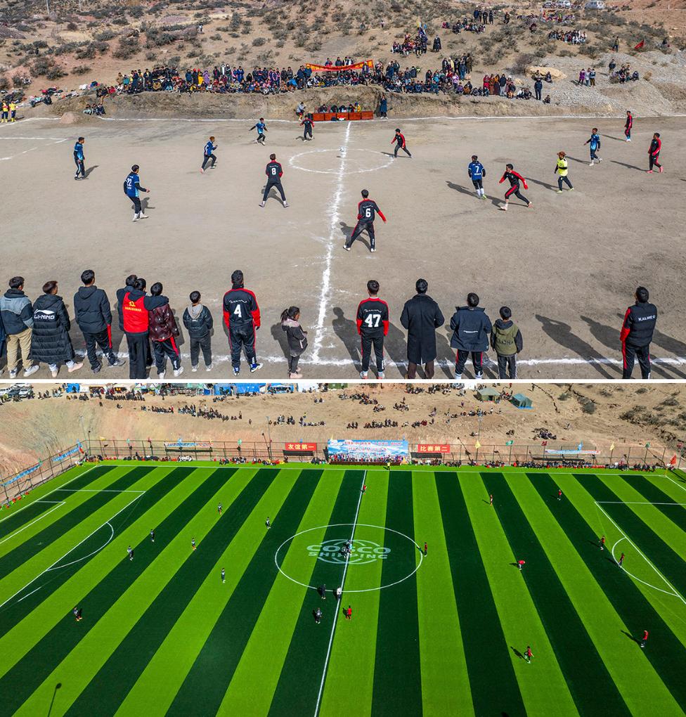 拼版照片:上圖為球員在馬利鎮(zhèn)馬利村“爸爸修的足球場(chǎng)”上比賽(2024年1月21日攝)。新華社記者 孫非 攝;下圖為球員在馬利鎮(zhèn)“云上球場(chǎng)”比賽(2025年1月2日攝)。新華社記者 丁增尼達(dá) 攝