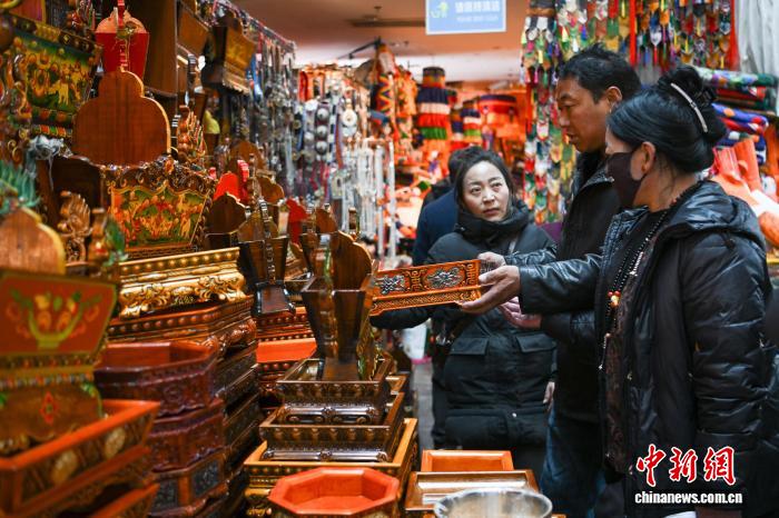 圖為市民在八廓商城選購(gòu)年貨切瑪盒。中新社記者 貢嘎來(lái)松 攝