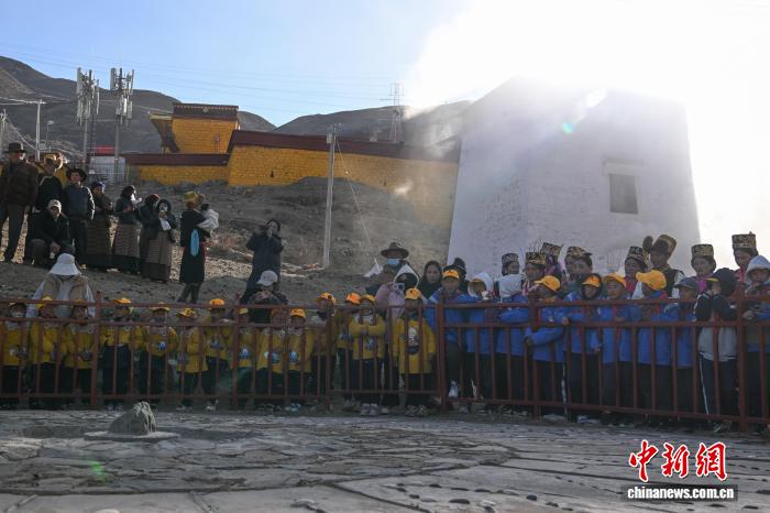 圖為達(dá)普天文觀測臺年度觀測活動現(xiàn)場,村民拋撒糌粑祈福豐收。中新社記者 貢嘎來松 攝