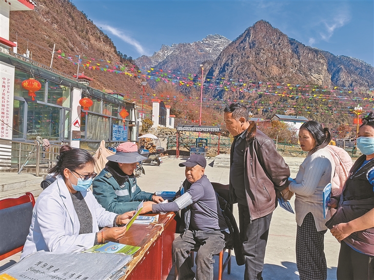 圖為醫(yī)護(hù)人員為莊堆村廣大群眾進(jìn)行義診體檢與健康宣傳。記者 武沛濤 攝
