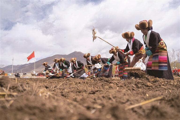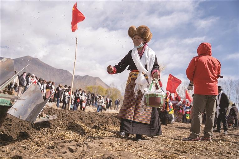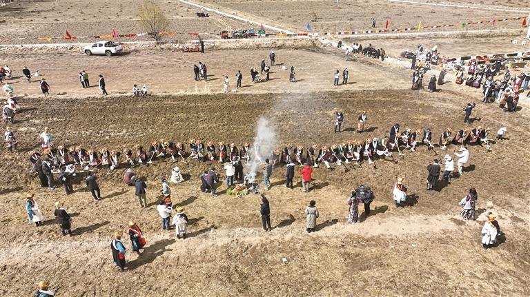 村民們身著節(jié)日盛裝,手捧象征五谷豐登的“切瑪”,將青稞酒與糌粑拋向天空,儀式感十足。村里的長者們高聲吟唱儀式歌謠,青壯年們吆喝著將“鐵?!睅胩镏?,鐵犁劃破沃土,婦女們依次撒下代表新一年希望的種子。傳統(tǒng)的“二牛抬杠”與轟鳴的現(xiàn)代農(nóng)機(jī)并肩作業(yè),古老農(nóng)耕智慧與現(xiàn)代農(nóng)業(yè)科技在此刻交融,既守住了文化根脈,也展現(xiàn)著高原農(nóng)業(yè)的蓬勃生機(jī)。