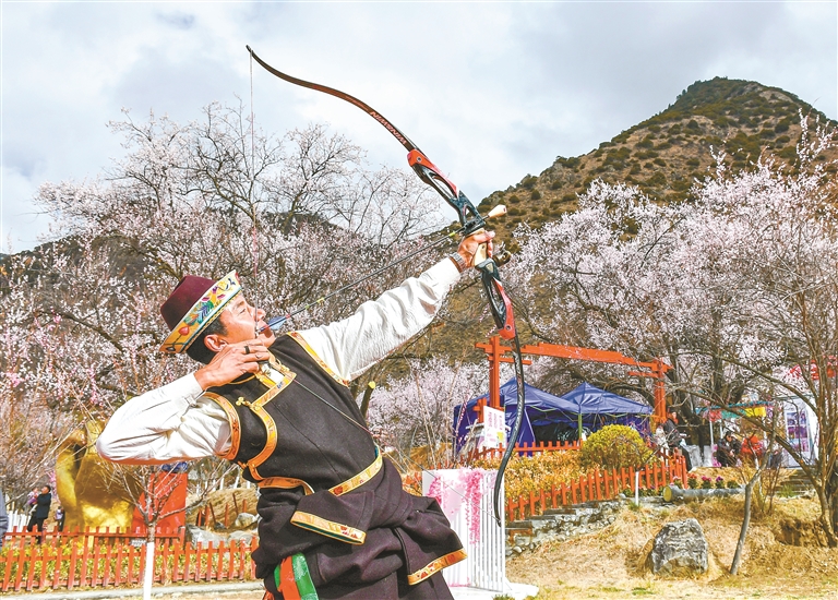 群眾在桃花園表演工布響箭。記者 劉楓 攝