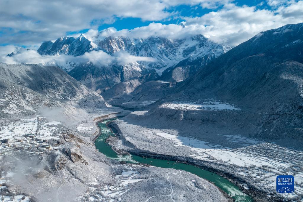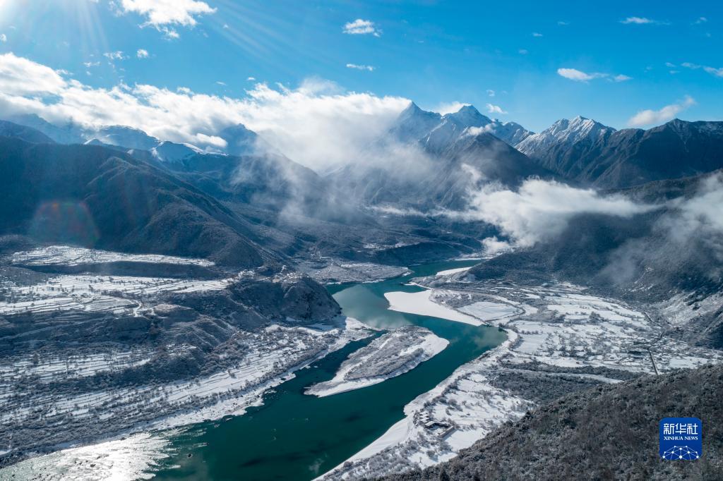 當日,西藏林芝市米林縣派鎮(zhèn)雅魯藏布大峽谷附近普降瑞雪,銀裝素裹的雅魯藏布江和南迦巴瓦峰顯得格外壯美。