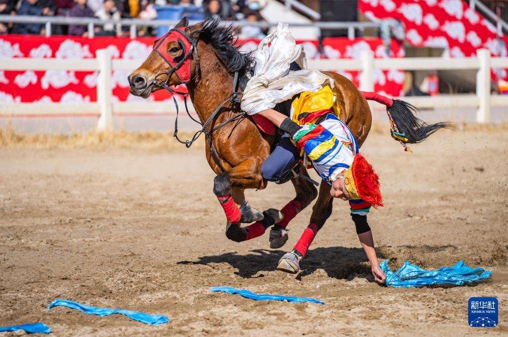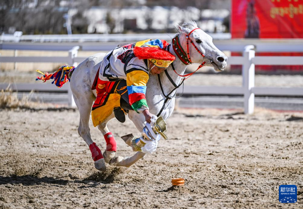 在拉薩賽馬場,騎手表演馬上拾哈達(dá)(2月12日攝)。新華社記者 孫非 攝