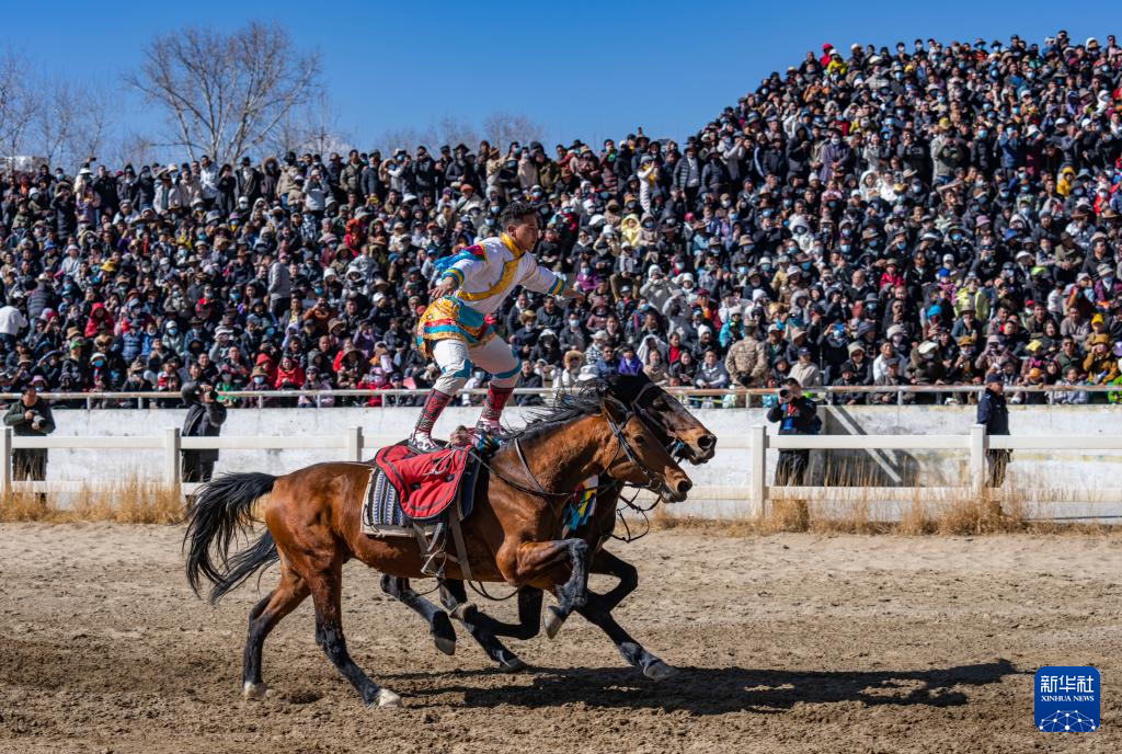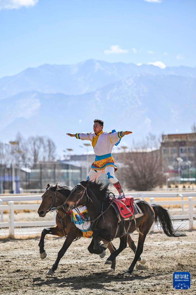 在拉薩賽馬場,騎手進(jìn)行雙馬單人表演(2月12日攝)。新華社記者 孫瑞博 攝