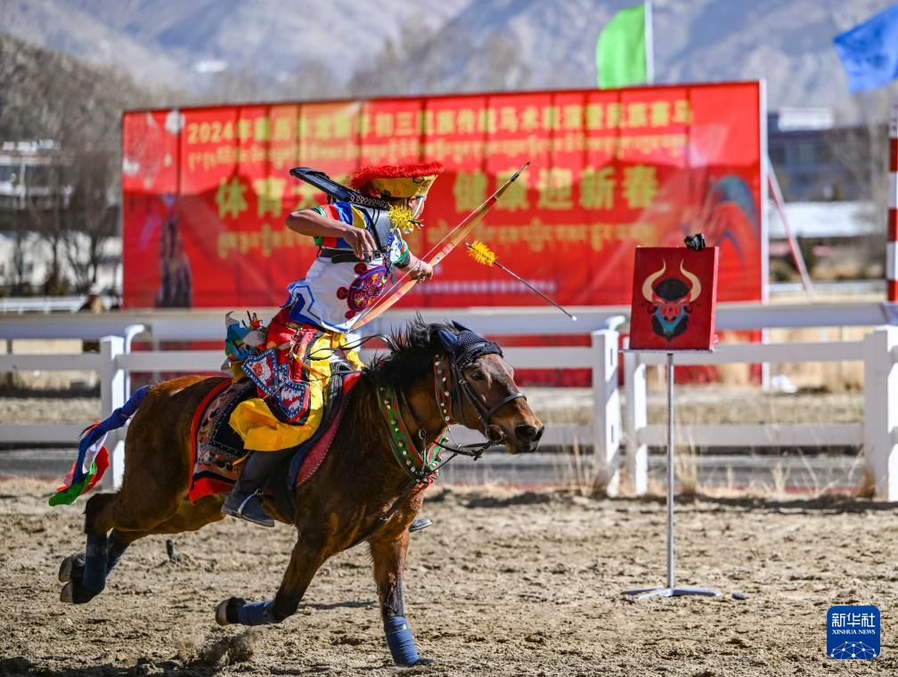 在拉薩賽馬場,騎手表演馬上射箭(2月12日攝)。新華社記者 孫非 攝
