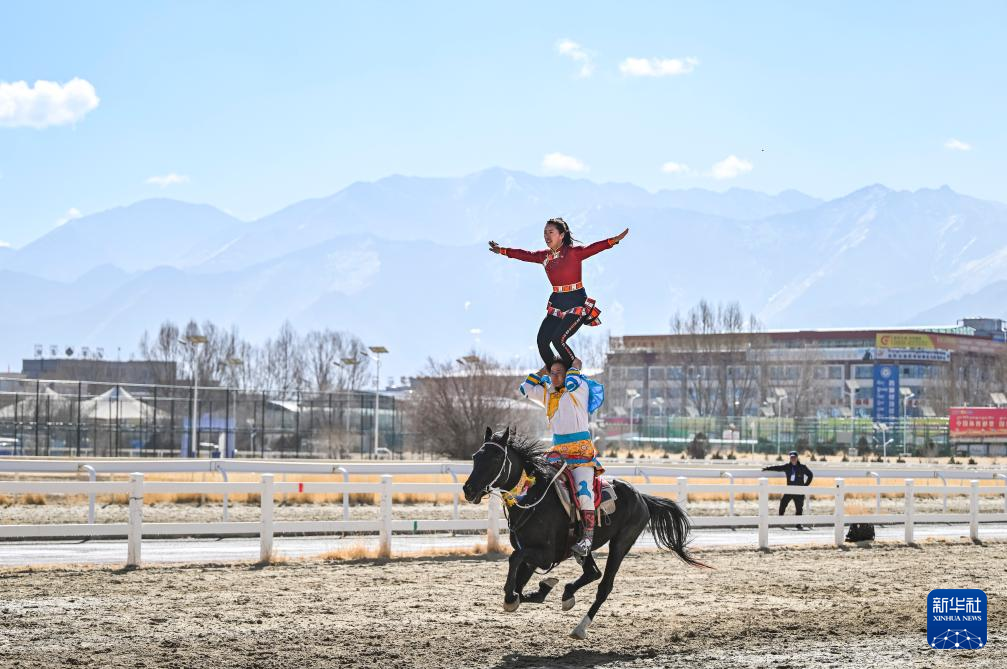 在拉薩賽馬場,騎手進(jìn)行單馬雙人表演(2月12日攝)。新華社記者 孫瑞博 攝
