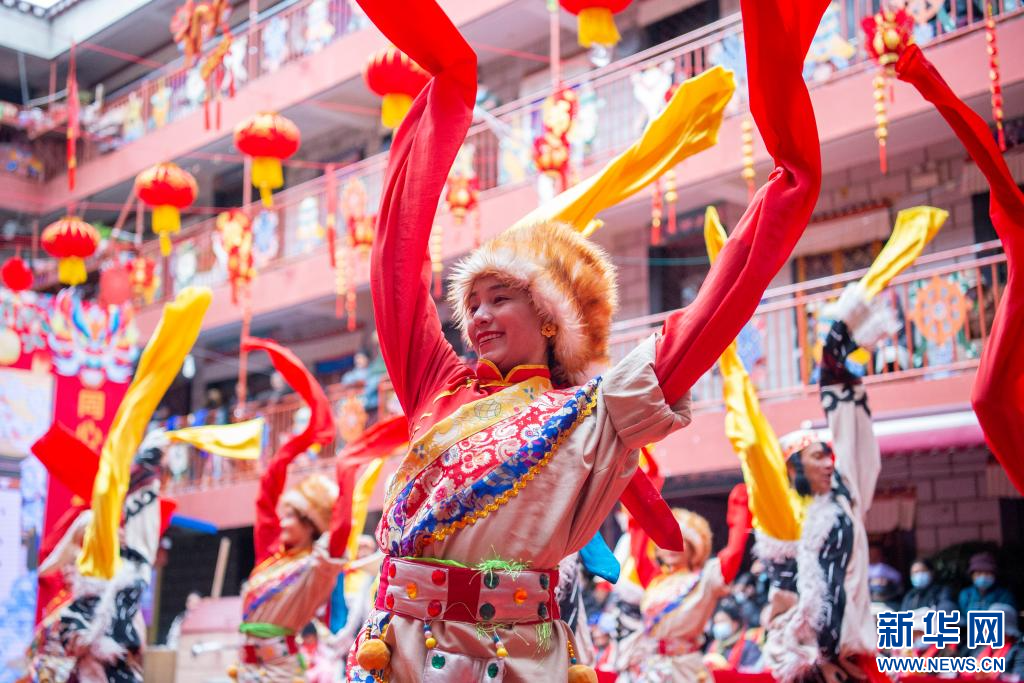 2月23日,拉薩市城關(guān)區(qū)雪巴拉姆藝術(shù)團的演員在德賽大院里表演。新華網(wǎng) 旦增努布 攝