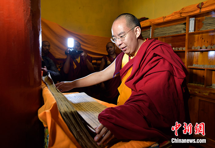 11月10日,班禪在日吾其寺文物陳列室內(nèi)翻看經(jīng)書。當(dāng)日,班禪在西藏日喀則市昂仁縣日吾其寺禮佛講經(jīng)。中新社記者 李林 攝