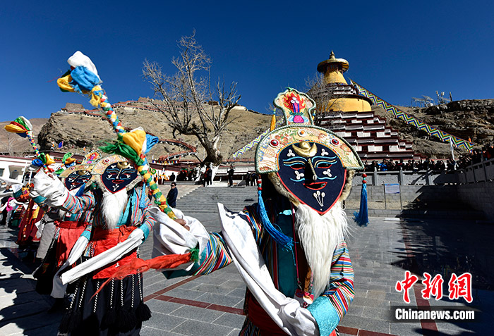 11月10日,民眾跳藏戲迎接班禪。當(dāng)日,班禪在西藏日喀則市昂仁縣日吾其寺禮佛講經(jīng)。中新社記者 李林 攝