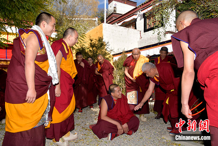 11月12日,班禪在扎西吉培寺辨經(jīng)場觀摩僧眾辨經(jīng)。當(dāng)日,班禪在西藏日喀則市謝通門縣扎西吉培寺禮佛。中新社記者 李林 攝