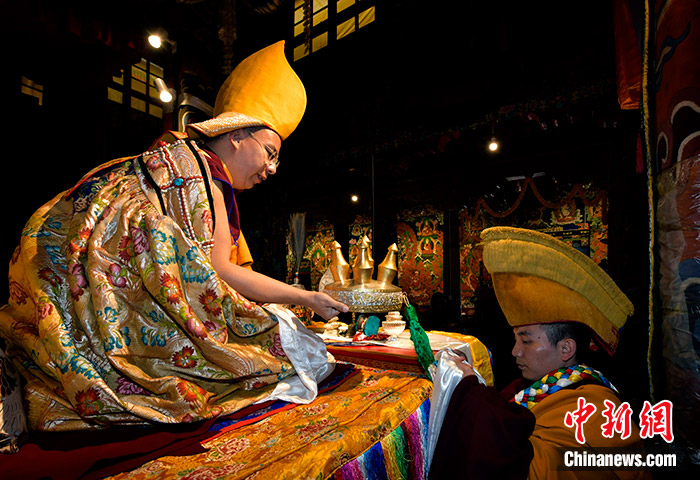 11月12日,扎西吉培寺瓊布 阿旺強(qiáng)巴堅(jiān)贊活佛向班禪敬獻(xiàn)曼扎。當(dāng)日,班禪在西藏日喀則市謝通門縣扎西吉培寺禮佛。中新社記者 李林 攝