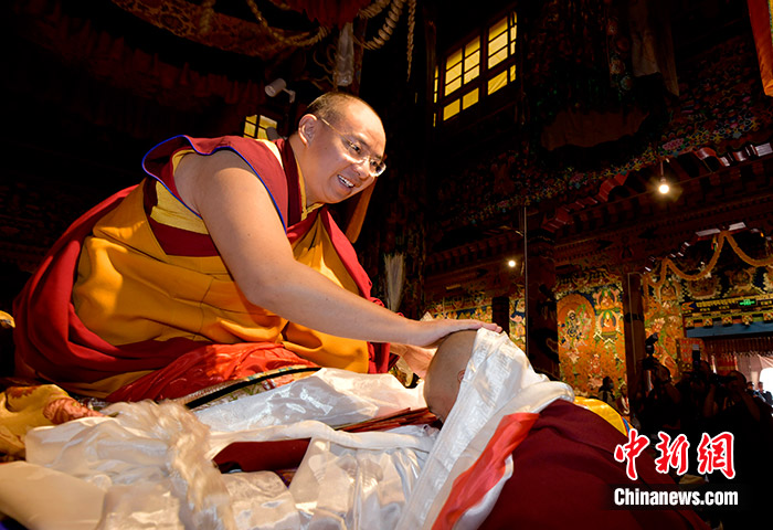 11月10日,班禪為信眾摸頂賜福。當(dāng)日,班禪在西藏日喀則市昂仁縣日吾其寺禮佛講經(jīng)。中新社記者 李林 攝