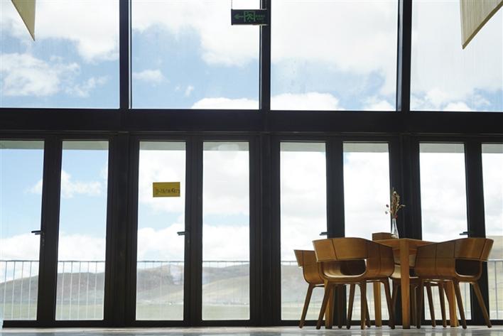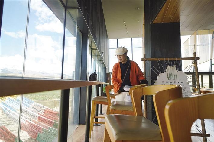 從正門進入,穿過牦牛文化空間走廊,便可到能夠以最佳視角欣賞念青唐古拉山的VR觀景臺。緊鄰觀景臺右側(cè),是一間擺放當(dāng)?shù)匚膭?chuàng)產(chǎn)品、各類書籍的觀景咖啡廳。該咖啡廳的兩面墻體設(shè)計為超大落地窗,在此休息的游客可以邊品嘗咖啡,邊欣賞念青唐古拉山及拉多草原的美景。走進咖啡廳,記者看到不少在這里休息的游客都在低頭寫著什么,經(jīng)咖啡廳負(fù)責(zé)人介紹:“這些游客是在寫明信片,我們這里不僅提供餐飲,還提供印有本地風(fēng)景的明信片,并同中國郵政合作,幫助游客按時將明信片寄到他們的親朋好友手中,讓游客們的旅途變得更有意義?!?/p>