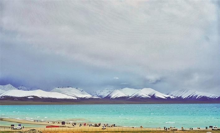 從羊八井出發(fā)至當(dāng)雄縣,有一條向左的岔路,沿著這條路一直向前開約60公里,就能到達西藏最著名的景區(qū)之一——納木措。納木措,湖面海拔4718米,形狀近似長方形,東西長70多千米,南北寬30多千米,湖的東南部是直插云宵、終年積雪的念青唐古拉山主峰,清澈的湖水便來自念青唐古拉山融化的冰雪,北側(cè)則倚偎著和緩連綿的高原丘陵,廣闊的草原繞湖四周,似是將納木措小心翼翼地護在懷中。湖水顏色由罕見的碧藍(lán)與碧綠色相結(jié)合,是畫師都不易調(diào)出的顏色,遠(yuǎn)遠(yuǎn)望去,碧波粼粼的湖水與周圍的山脈、草原、藍(lán)天、白云交相輝映,令在場的人不禁連連感嘆仿佛置身于仙境之中。